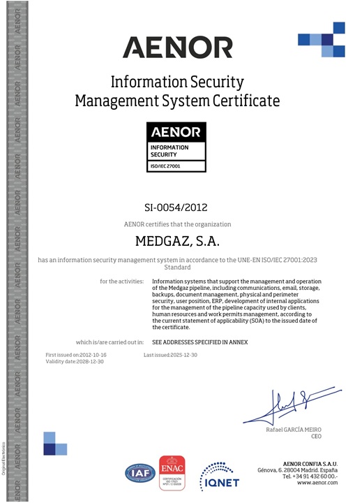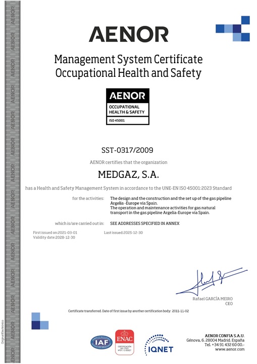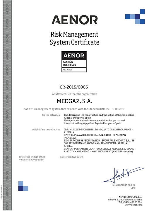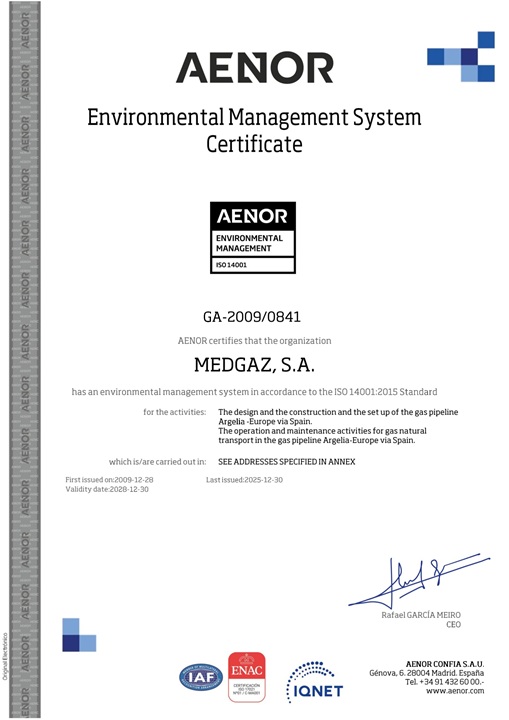 Likewise, MEDGAZ‘s Material Manufacturing, Operation and Maintenance activities (in its compression and receiving stations and deepwater pipeline) are also certified by LRQA (former LLoyds Register) since 2011 and periodically renewed.