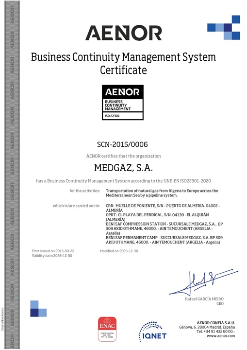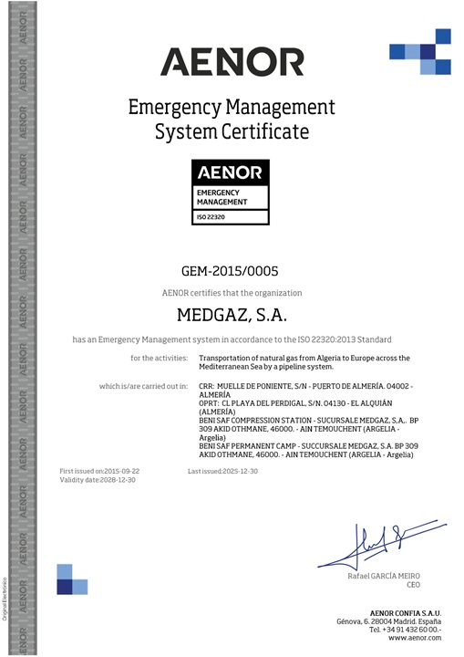 MEDGAZ  has consistently demonstrated its ongoing commitment to guaranteeing excellence in safety, environmental and quality performance at its facilities. This commitment is reflected in the design of all the project’s infrastructures and components, from the pipe lay operations to the technology deployed at the compressor station and receiving terminal, including the selection of construction methods that minimize environmental impacts. Moreover, MEDGAZ has achieved ISO 14001, ISO 45001, ISO 27001, ISO 22301, ISO 31000 and ISO 22320 certifications.