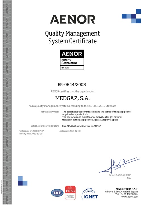 MEDGAZ has successfully completed the process to secure certification for the management and operation of the project to build an Algerian-European gas pipeline via Spain, in according with the ISO 9001 quality specifications.